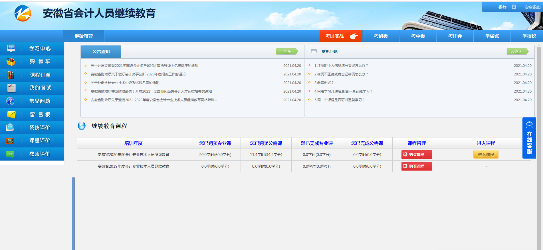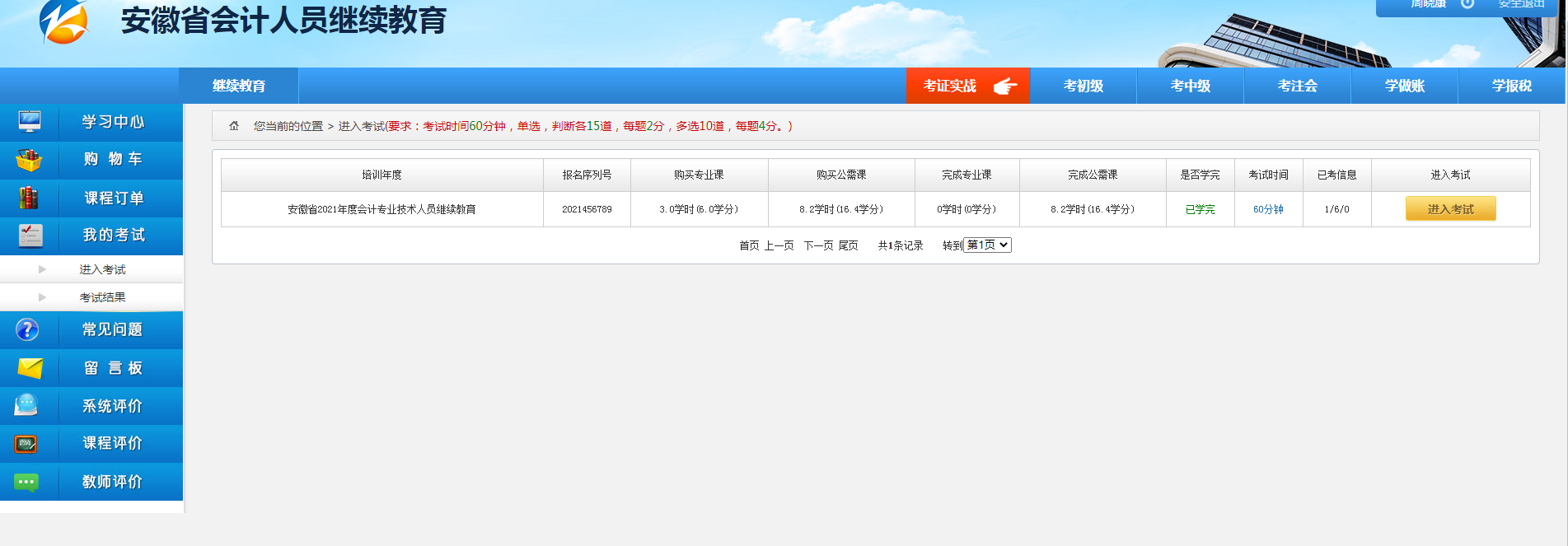 学够规定的学习时间后,点击“我的考试-进入考试”参加在线考试。